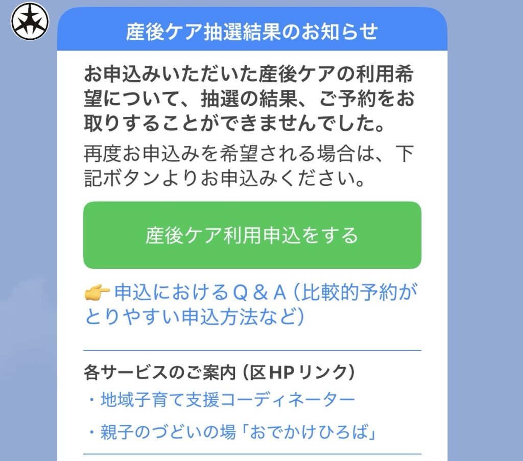 登録したものの、当時は電話申し込み&金曜日破水して出産→月曜日退院も、翌日診察しに行かないといけなく、さらに訪問看護がその翌日にあったりと、タイミングがなく、バタバタしてる間にパパが育休取ってくれて、自分の中でパパ育休中私もベビも居ないのはもったいない?意味がない?と思ったので、そうこうしてるうちにタイミングを逃してしまいました💦💦